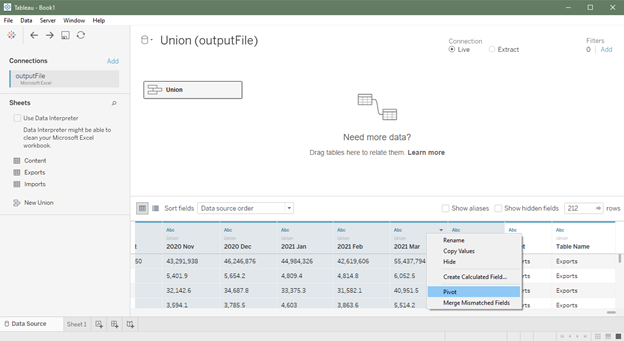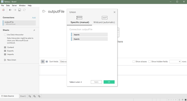 Once imported, create a new union on Tableau by dragging “New Union” to the center.