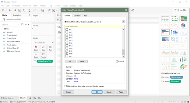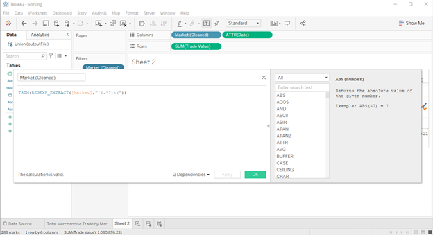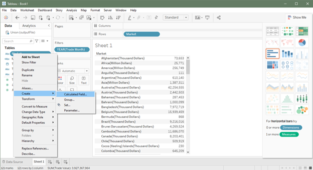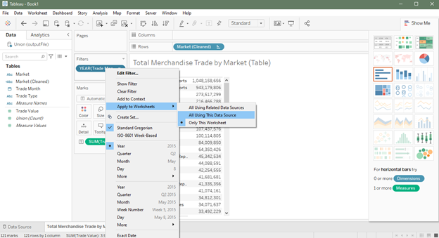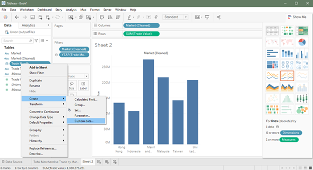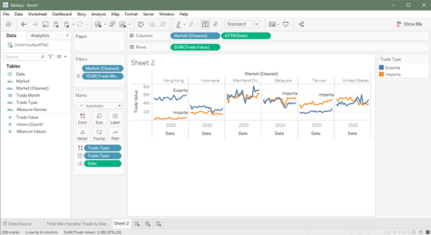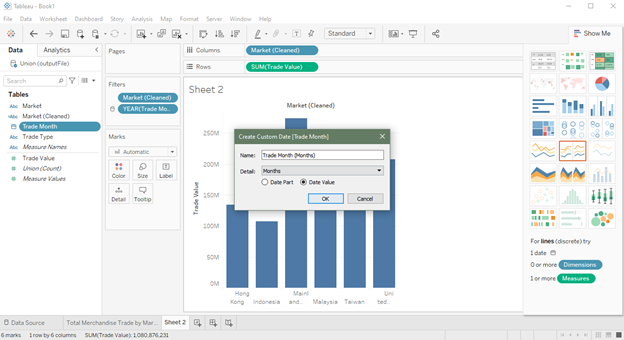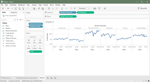 Next, drag “Market (Cleaned)” and “Date” to columns. Drag “Trade Value” to Rows.
