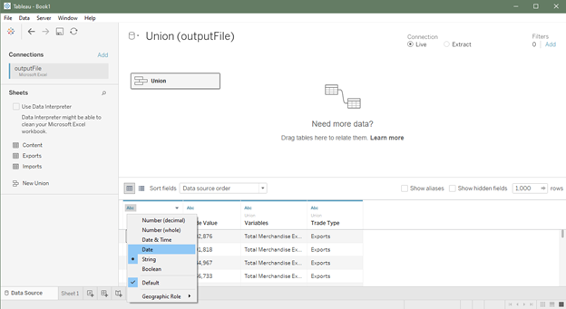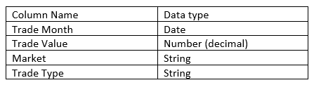 We need to ensure that our columns are using the correct data types. “Trade Month” should be a Date type. “Trade Value” should be a Number (decimal) type. “Market” and “Trade Type” should be string types. To change a column’s data type, simply click on the top left-hand corner of the column and select the appropriate data type.