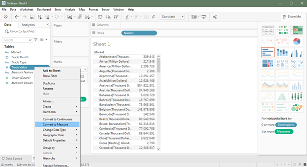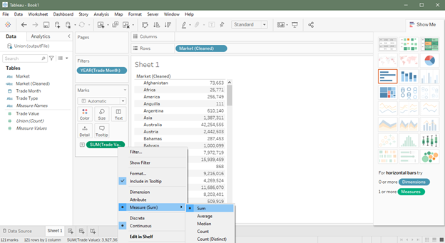 Drag “Trade Value” to “Text” in the marks box. Right-click on “Trade Value” in the marks box and ensure that the measure being used is SUM.