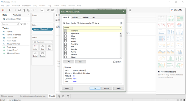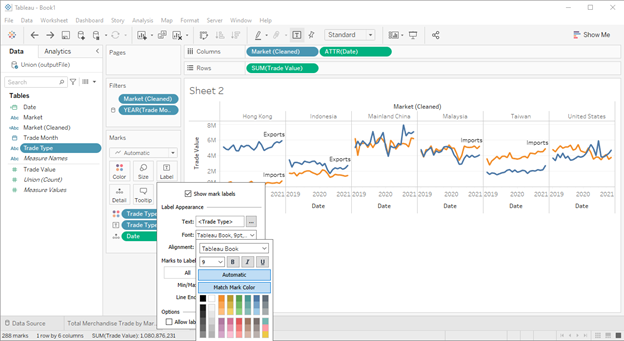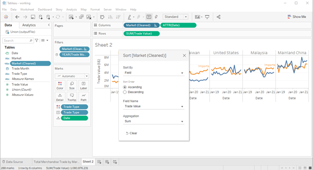 Sort the panes by “Trade Value”. Right-click on “Market (Cleaned)” in the columns and click “Sort…”. For Sort By choose “Field”, for Sort Order choose “Descending”, for Field Name choose “Trade Value”, and for Aggregation choose “Sum”. Now the panes are in a logical order.