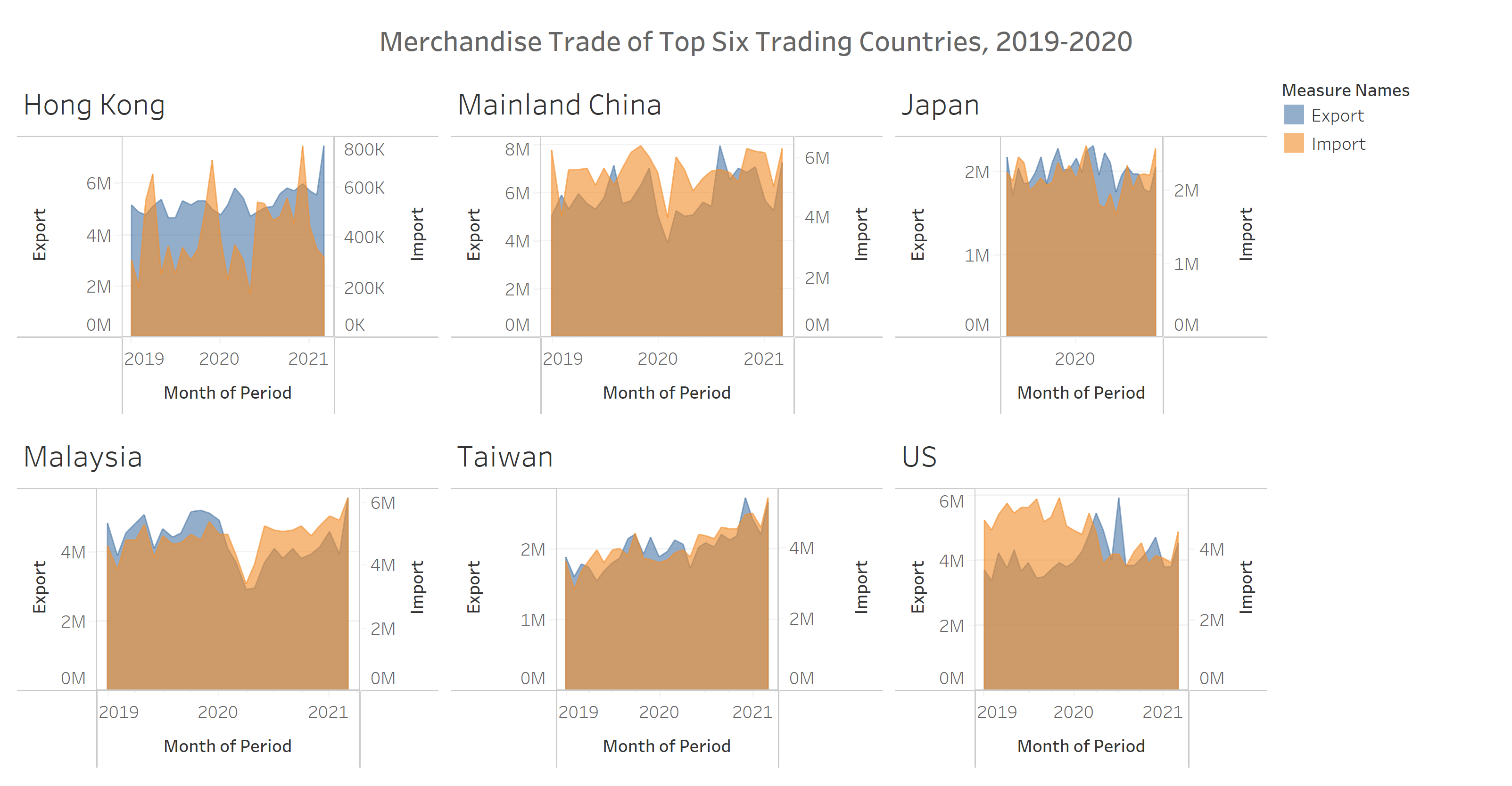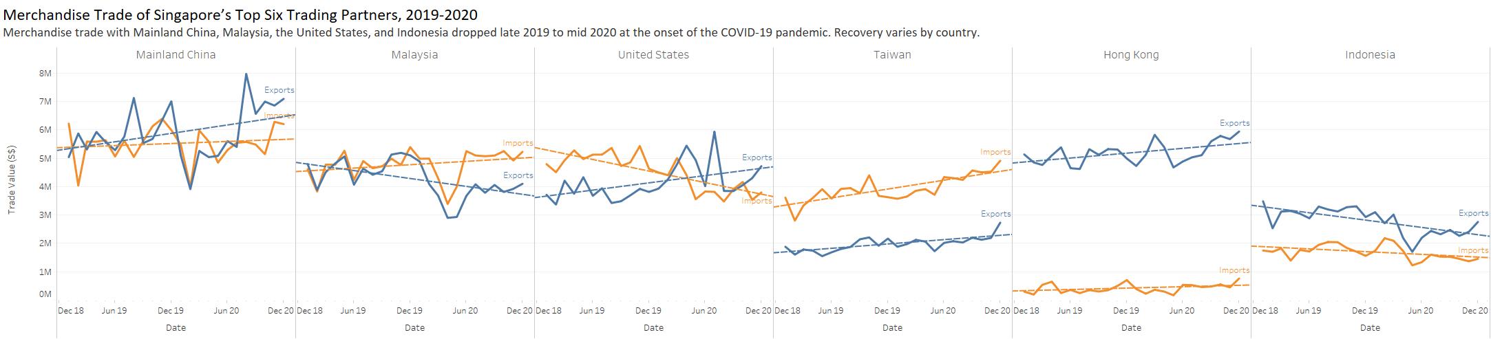 The redesign also includes a subtitle that shares a possible main insight to be gleaned from the graphic: “Merchandise trade with Mainland China, Malaysia, the United States, and Indonesia dropped late 2019 to mid 2020 at the onset of the COVID-19 pandemic. Recovery varies by market.”