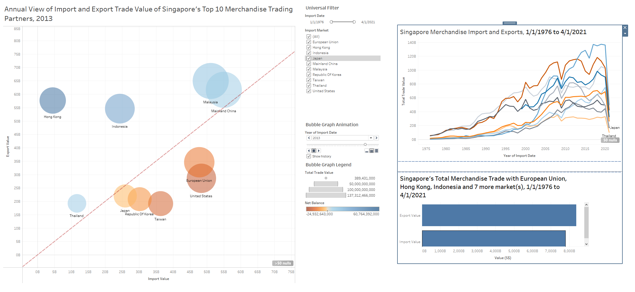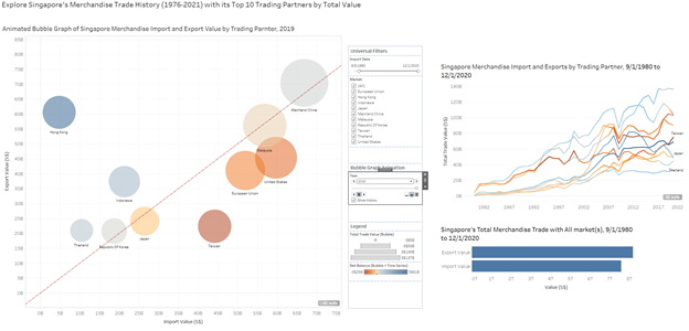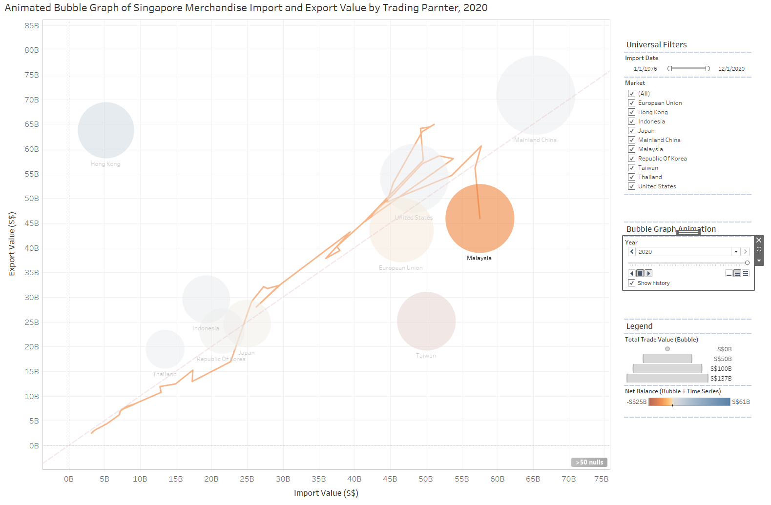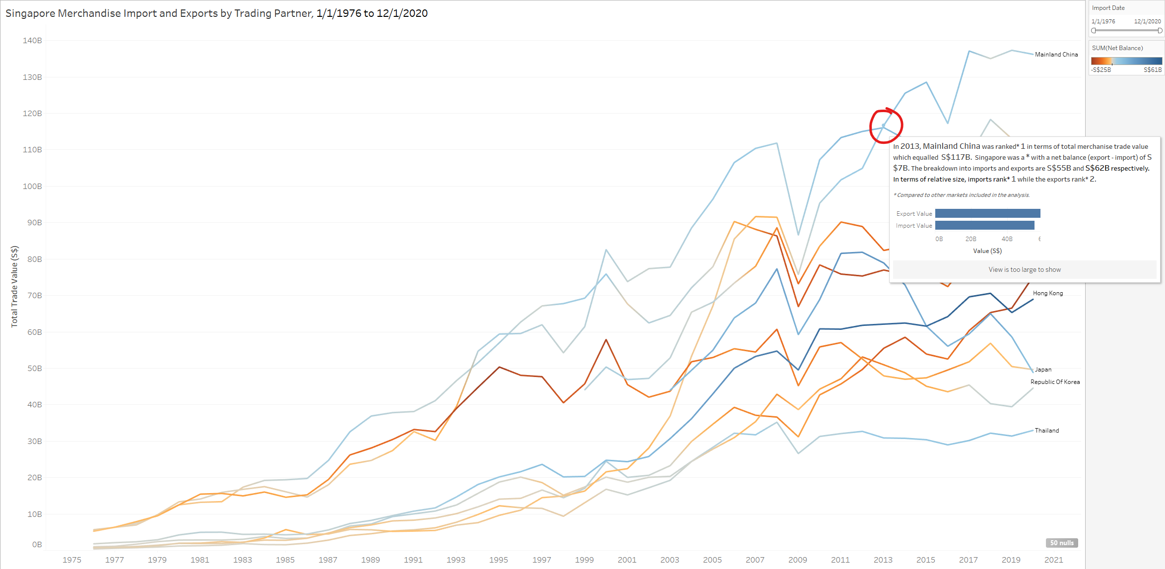 | O1 | From the “Time Series” graph, we can see that China overtook Malaysia as Singapore’s top trading partner in terms of total trade value in 2013 (S$117B vs. S$116B). Since then, trade with China has steadily increased up to S$136B in 2020 while Malaysia has decreased (S$103B). From the history line of the “Motion” graph, we further see exports with Malaysia appear to have decreased while imports have increased. | ![]() |