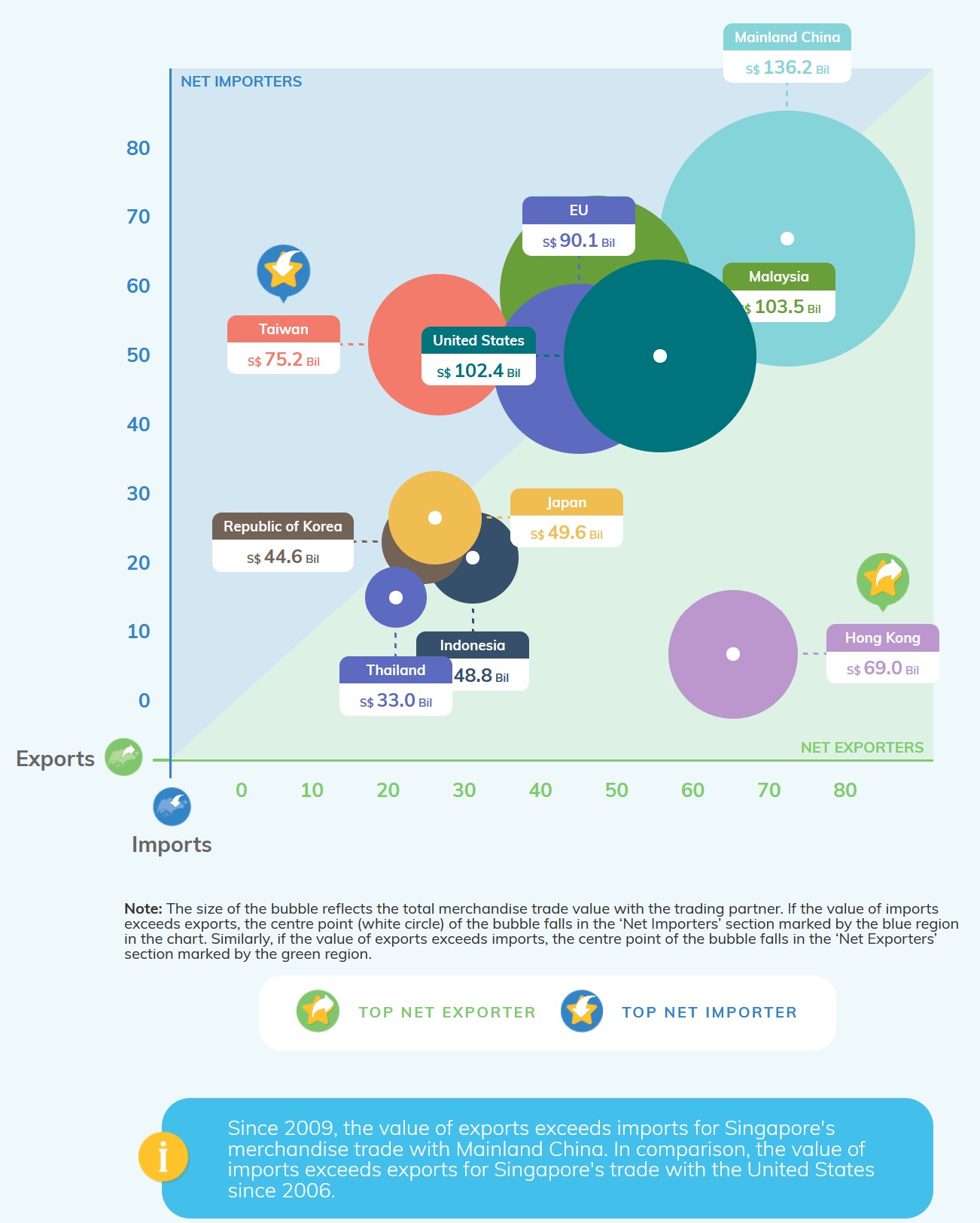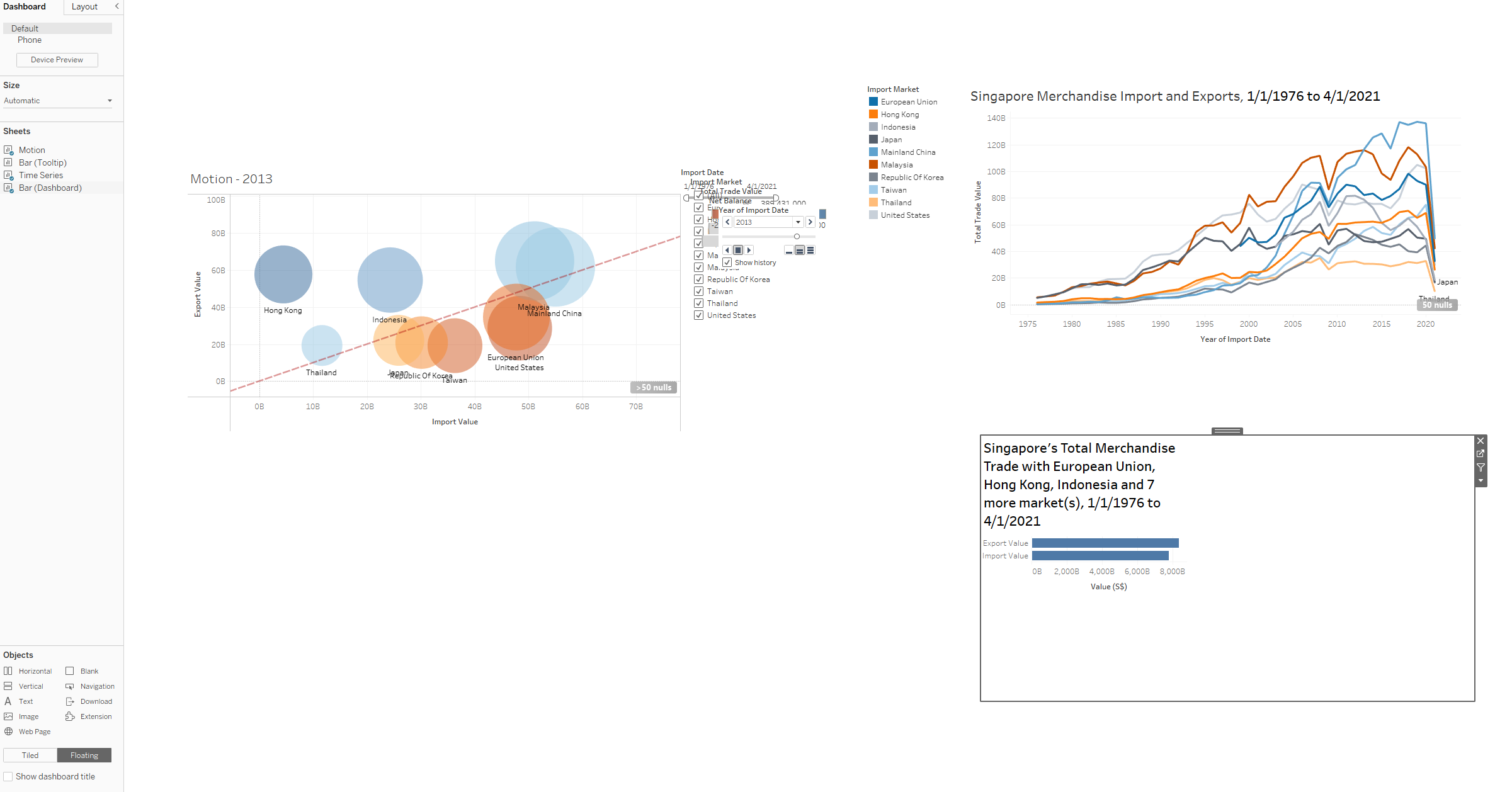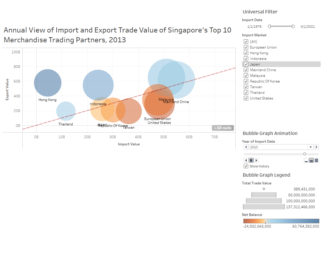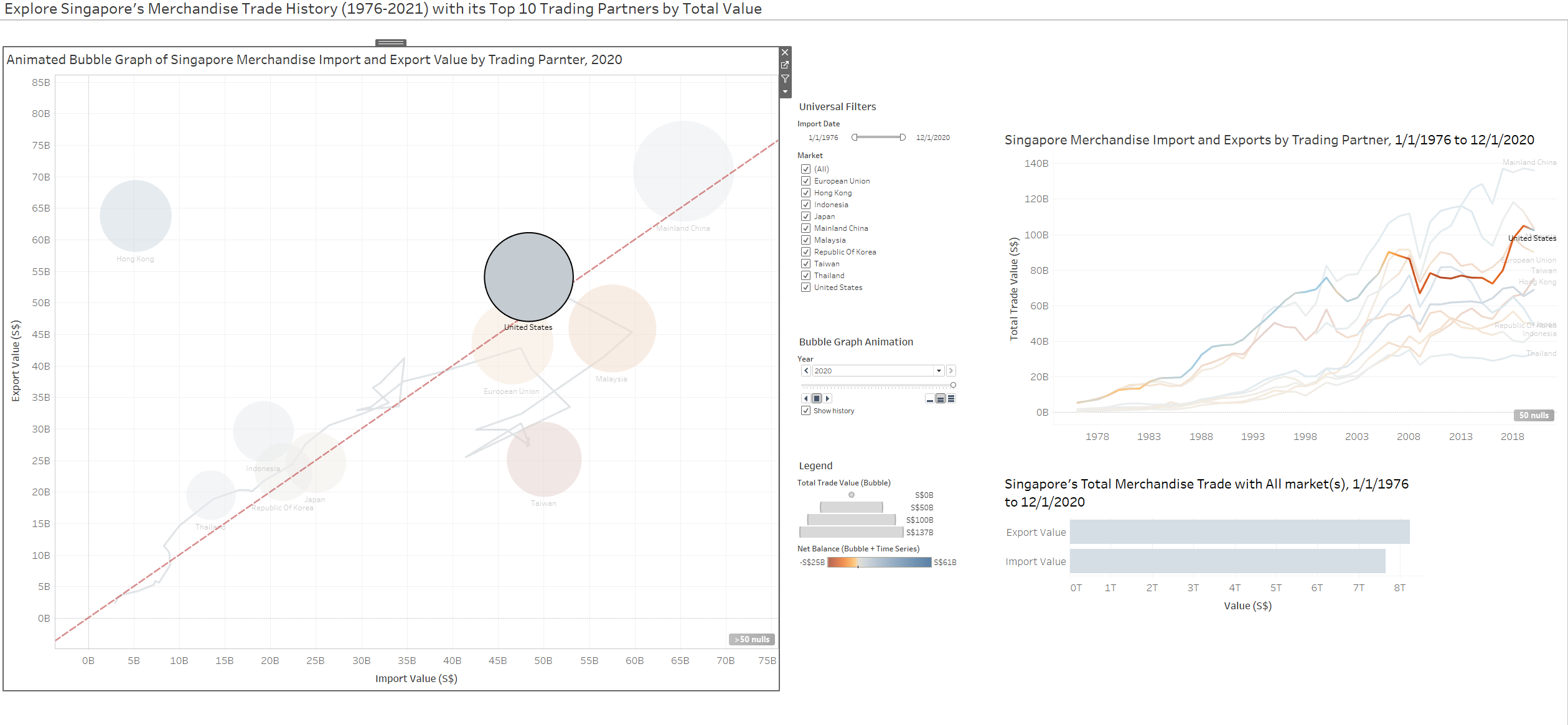 | O1 | From the “Time Series” graph, we can see that China overtook Malaysia as Singapore’s top trading partner in terms of total trade value in 2013 (S$117B vs. S$116B). Since then, trade with China has steadily increased up to S$136B in 2020 while Malaysia has decreased (S$103B). From the history line of the “Motion” graph, we further see exports with Malaysia appear to have decreased while imports have increased. | ![]() |