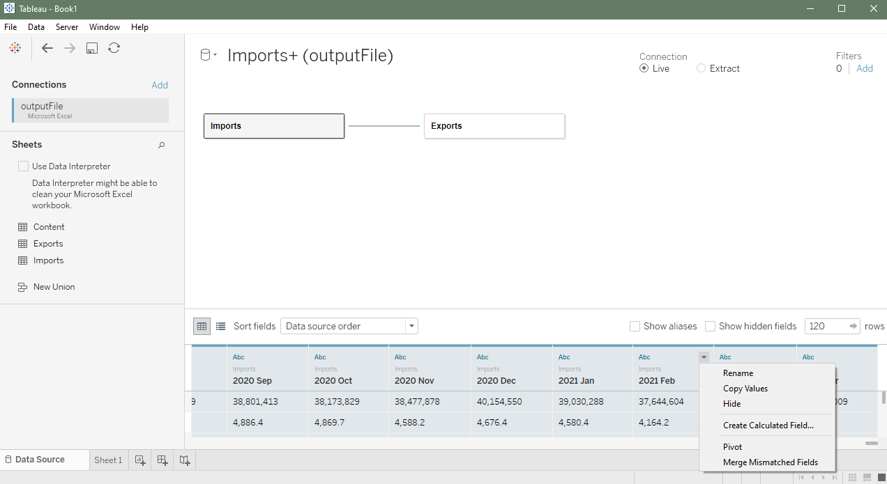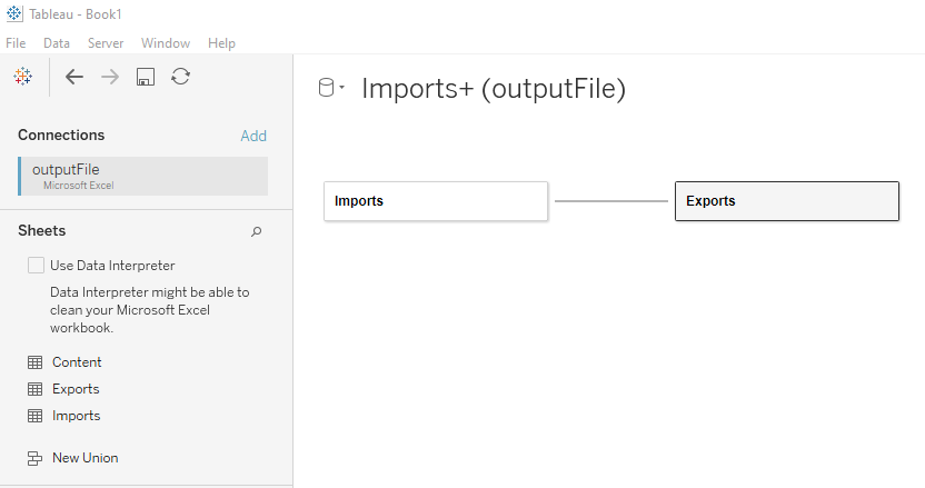 | S1 | Open a new Tableau notebook. On the left-hand panel, import the file “outputFile.xlsx”. Once imported, drag the import table into the main pane. Next, drag the export table into the main pain to create a relationship between the two tables. | ![]() |