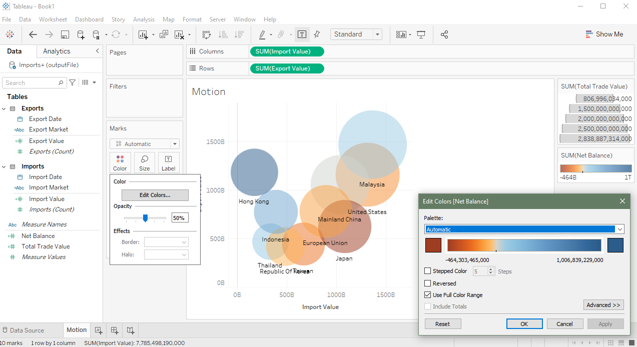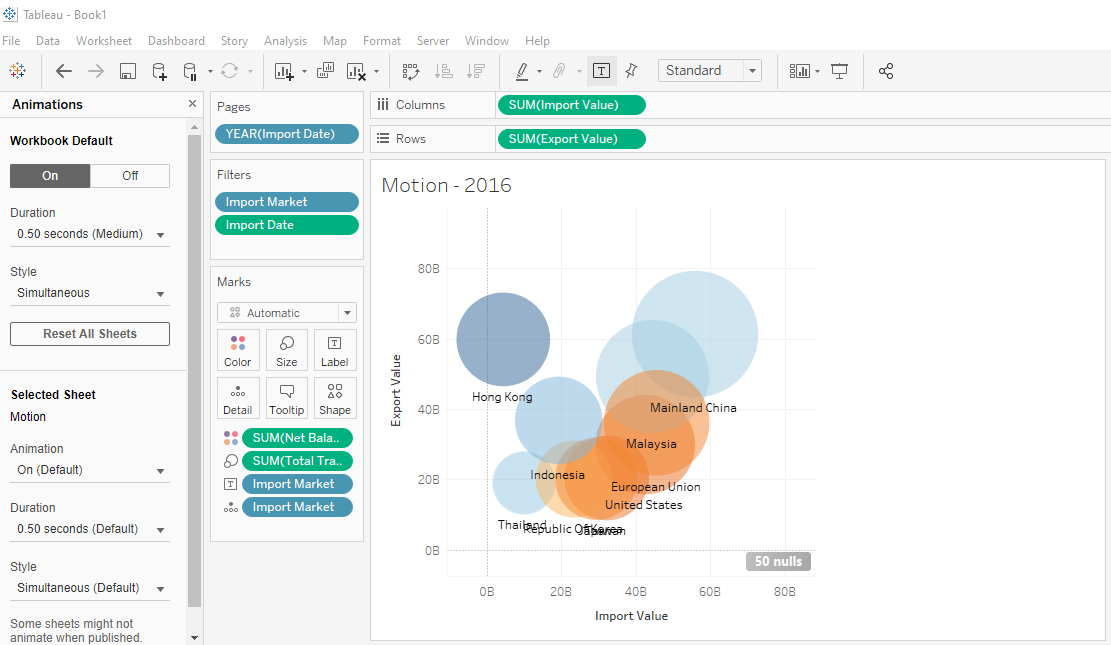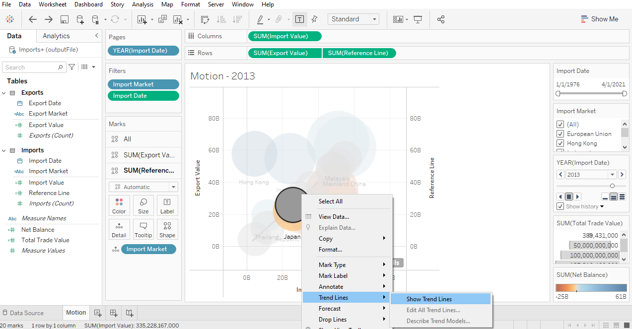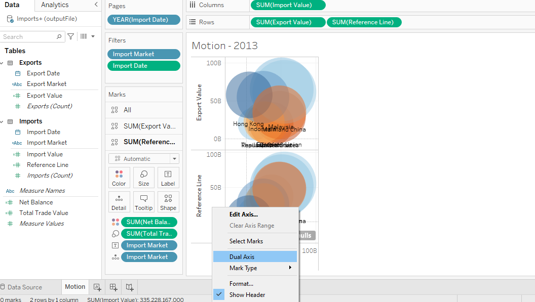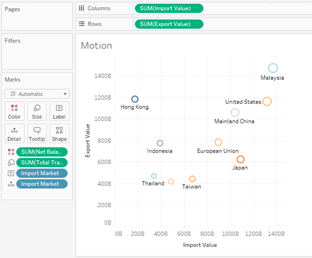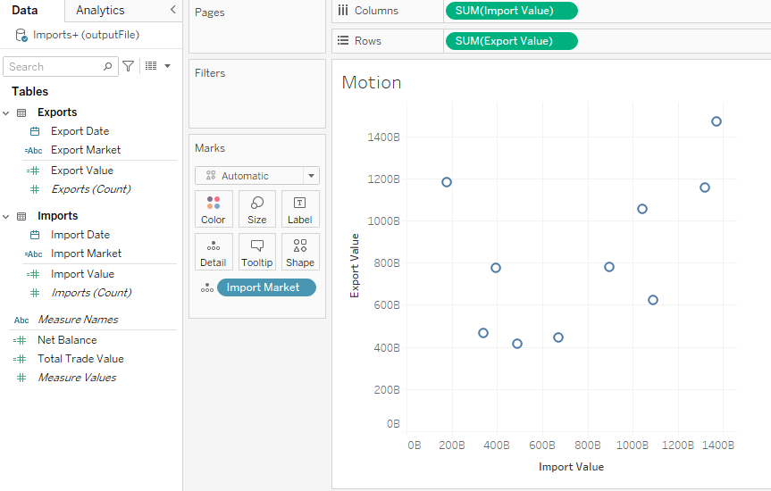 | S8 | Create a new worksheet and name it “Motion”. Drag “Import Value” to Columns, “Export Value” to Rows, and “Import Market” to the Detail shelf. The resulting graph should look something like what you see on the right. | ![]() |