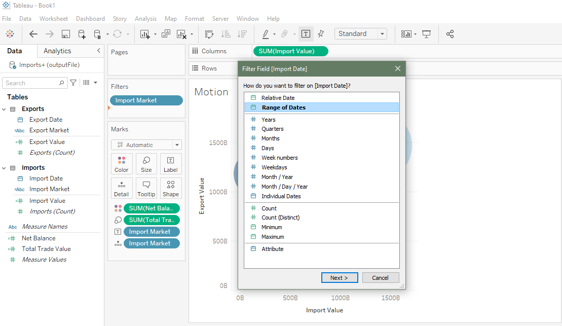 | S12 | Now, let’s add some filters. Drag “Import Market” to the Filters shelf. The default settings are ok. Drag “Import Date” to the Filters shelf. For dates, choose the “Range of Dates” option and click “Next” > “OK”. Show both filters by right-clicking and clicking “Show Filter”. |