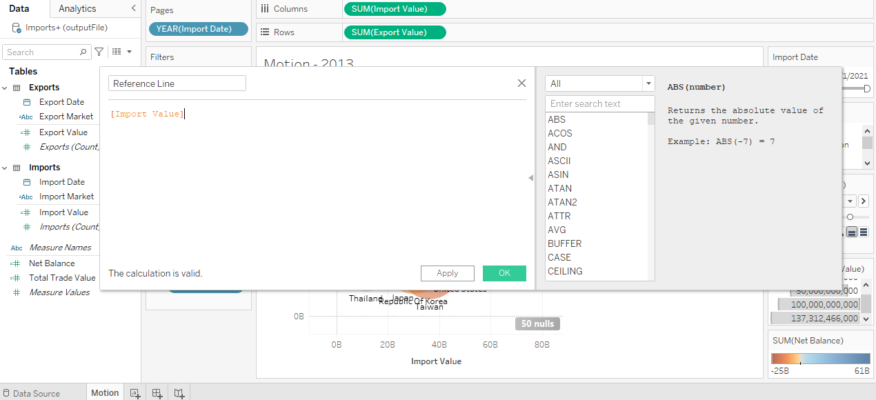 | S15 | Now, we’re going to add a diagonal reference line to visually separate “net importers” and “net exporters”. First, create a calculated field named “Reference Line” and input “Import Value”. | ![]() |