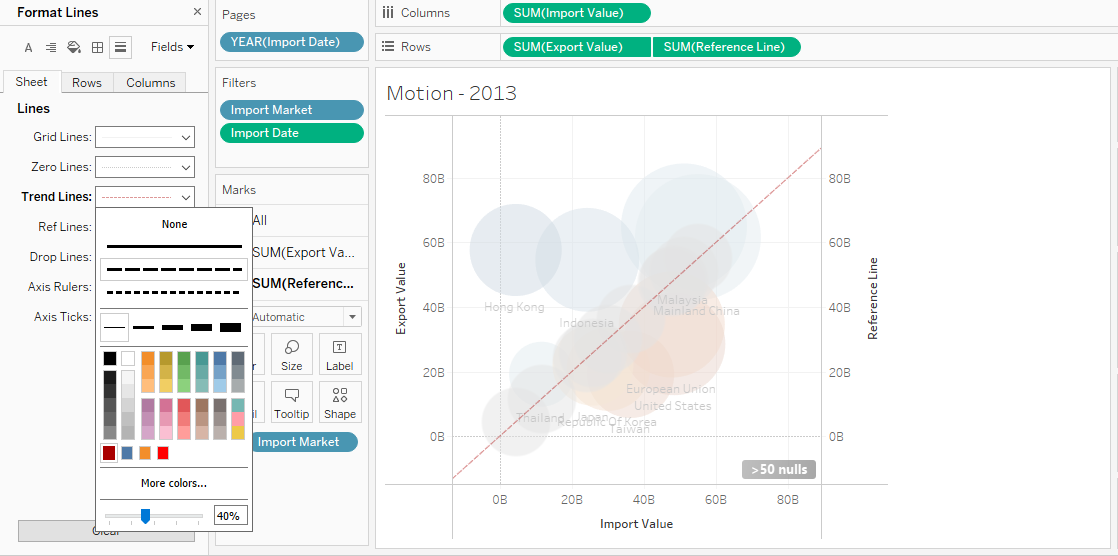 | S20 | Let’s clean up the graph a bit. First, remove all the fields from the “Reference Line” Marks shelf except for the “Import Market” Detail. Second, again for the “Reference Line” Marks shelf, click on the Size shelf and decrease the size to the lowest. Third, again for the “Reference Line” Marks shelf, click on the Color shelf and change opacity to 0%. Lastly, right-click on the “Reference Line” axis and uncheck “Show Header”. |