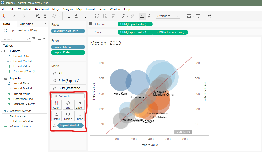 | S31 | Drag “Import Market” to the Label and Detail shelves. Drag “Net Balance” to the Color shelf. |
