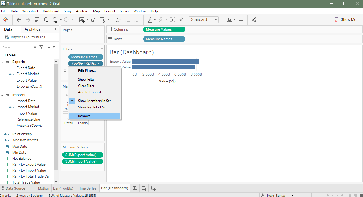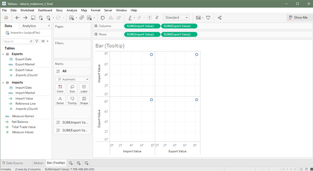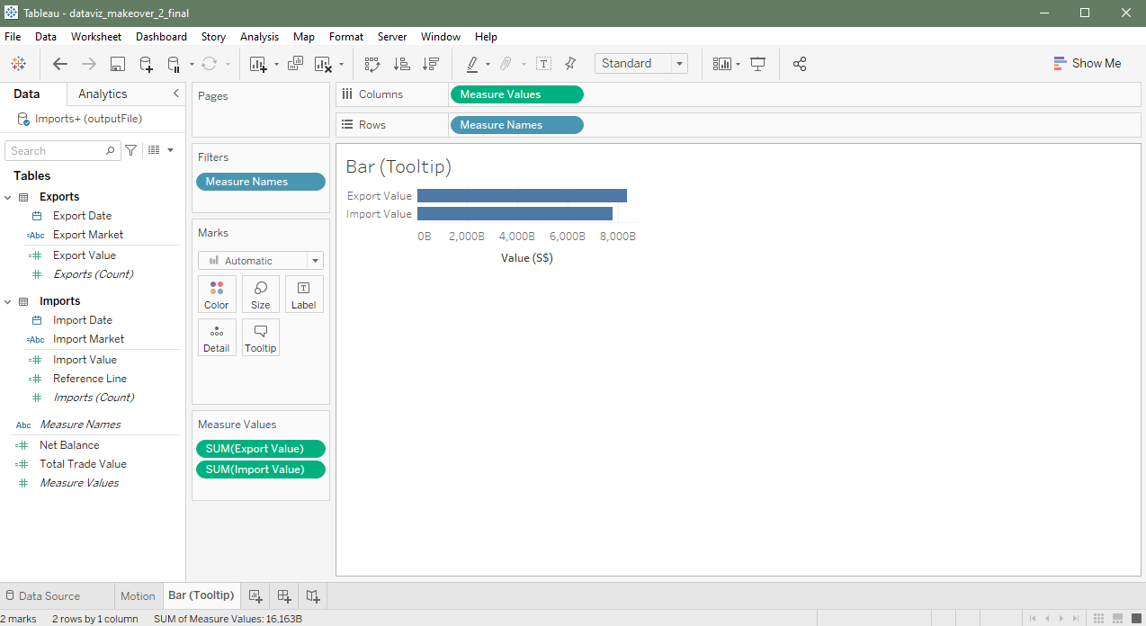 | S21 | Now, we’ll work on adding some details in the tooltip. First, create a new worksheet and name it “Bar (Tooltip)”. Drag “Import Value” and “Export Value” to both Columns and Rows. Next, click on “Show Me” on the top right-hand corner and click on the horizontal bar graph. |