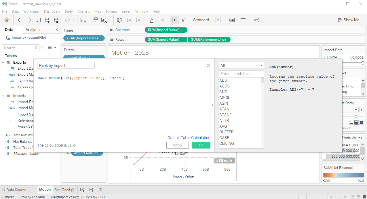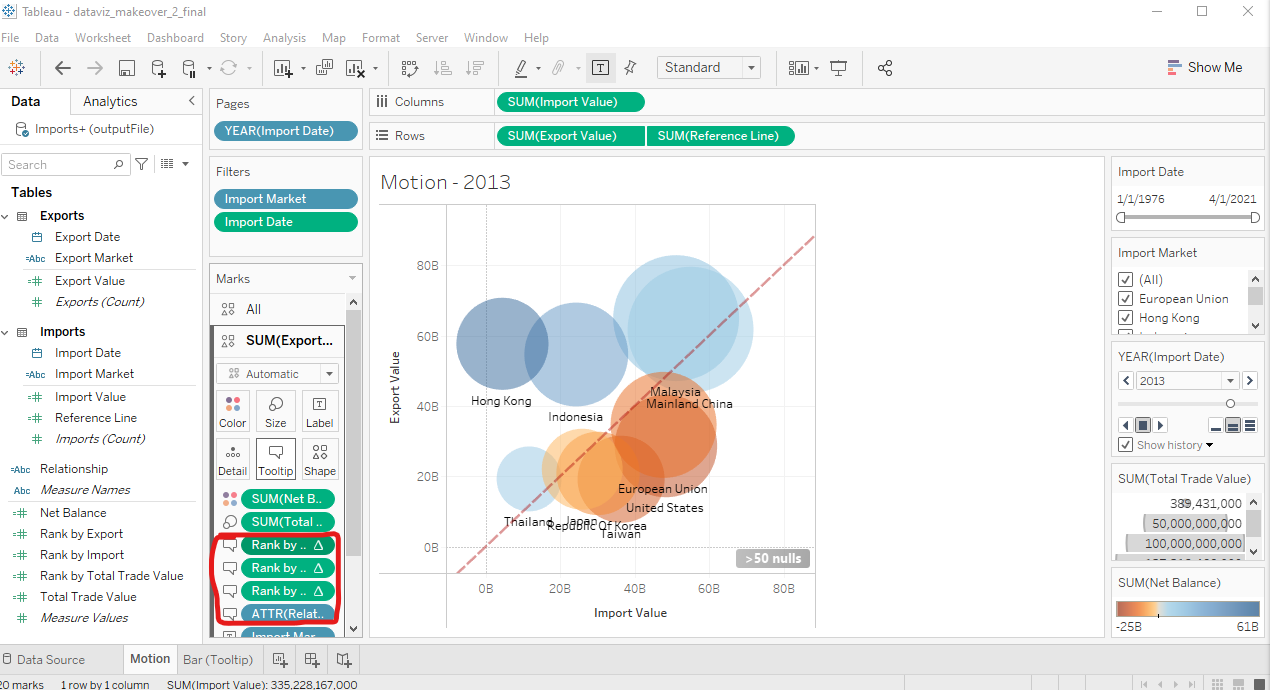 | S23 | Back to the “Motion” worksheet. We’re going to create four new calculated fields: Name: “Rank by Total Trade Value” Formula: Name: “Rank by Import Value” Formula: Name: “Rank by Export Value” Formula: Name: “Relationship” Formula: ELSE ‘net exporter’ END |