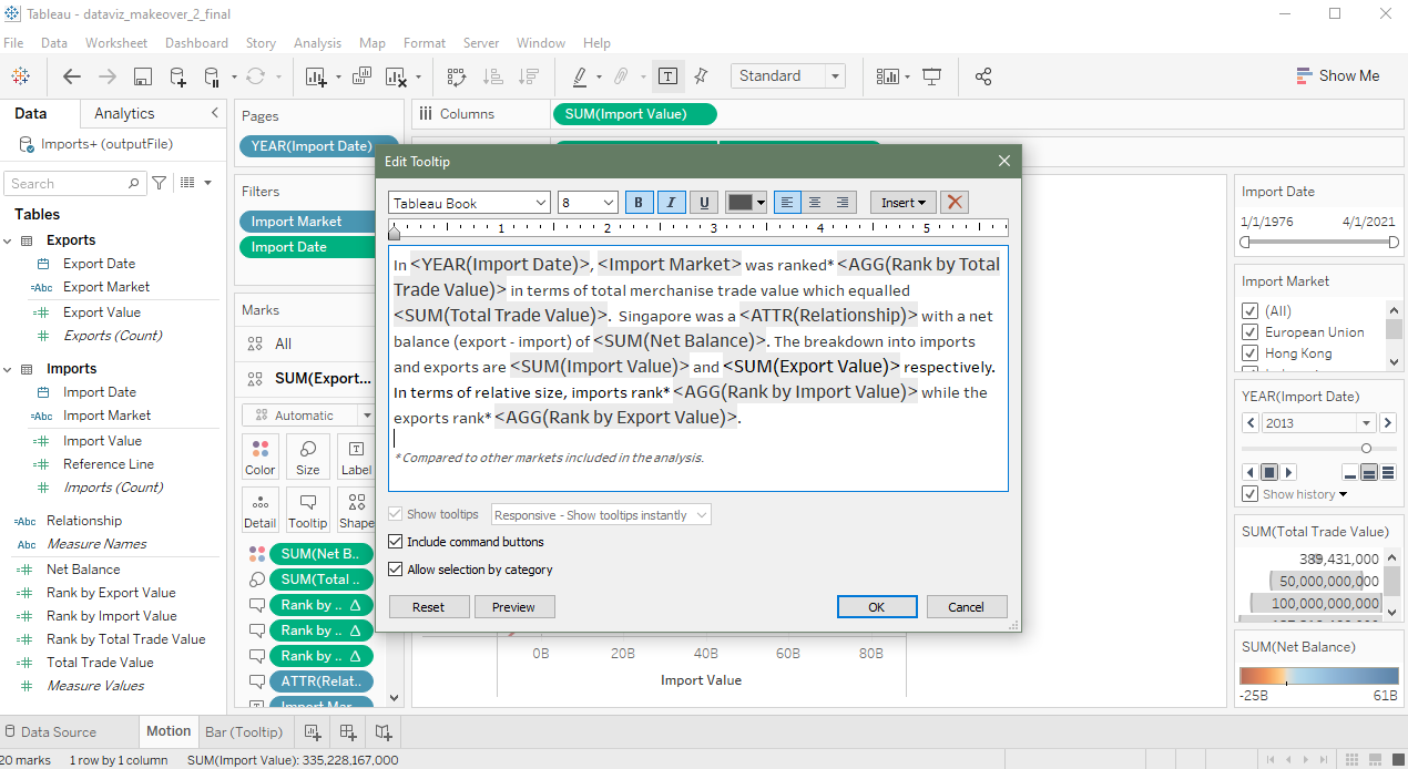 | S26 | Click on the Tooltip shelf and input the following text: In <YEAR(Import Date)>, * Compared to other markets included in the analysis. |