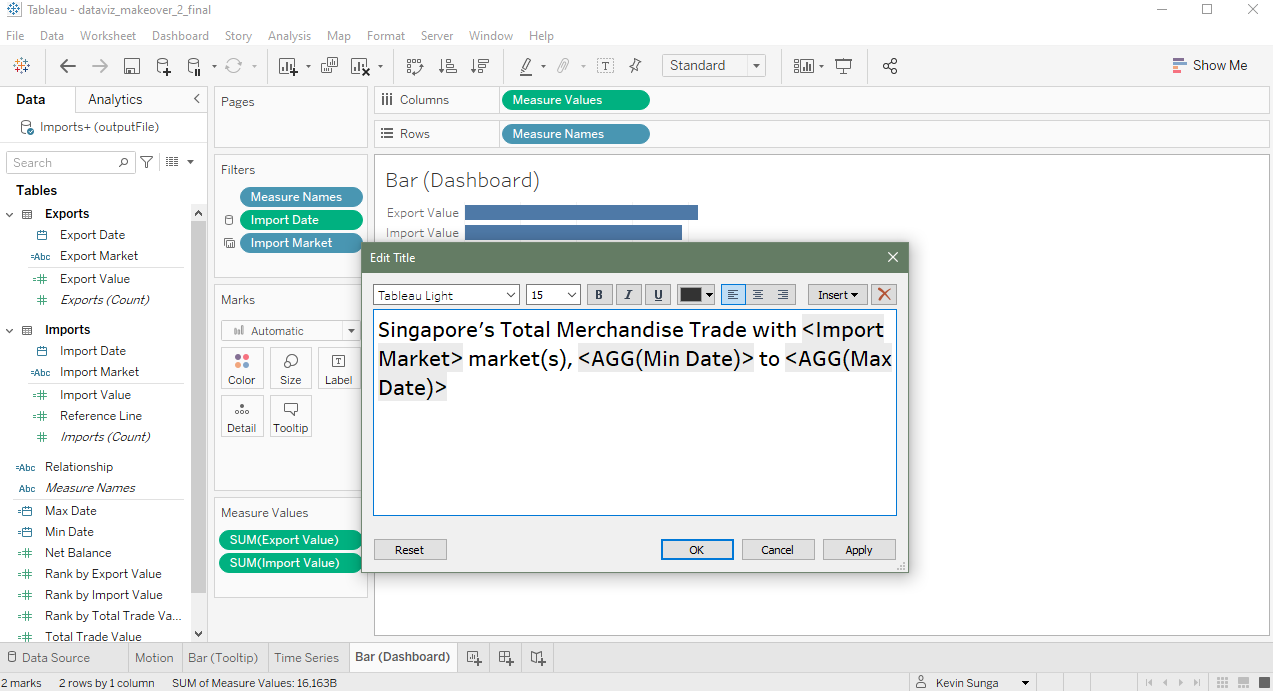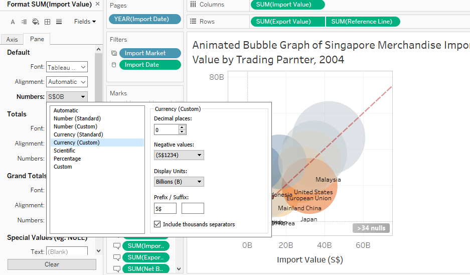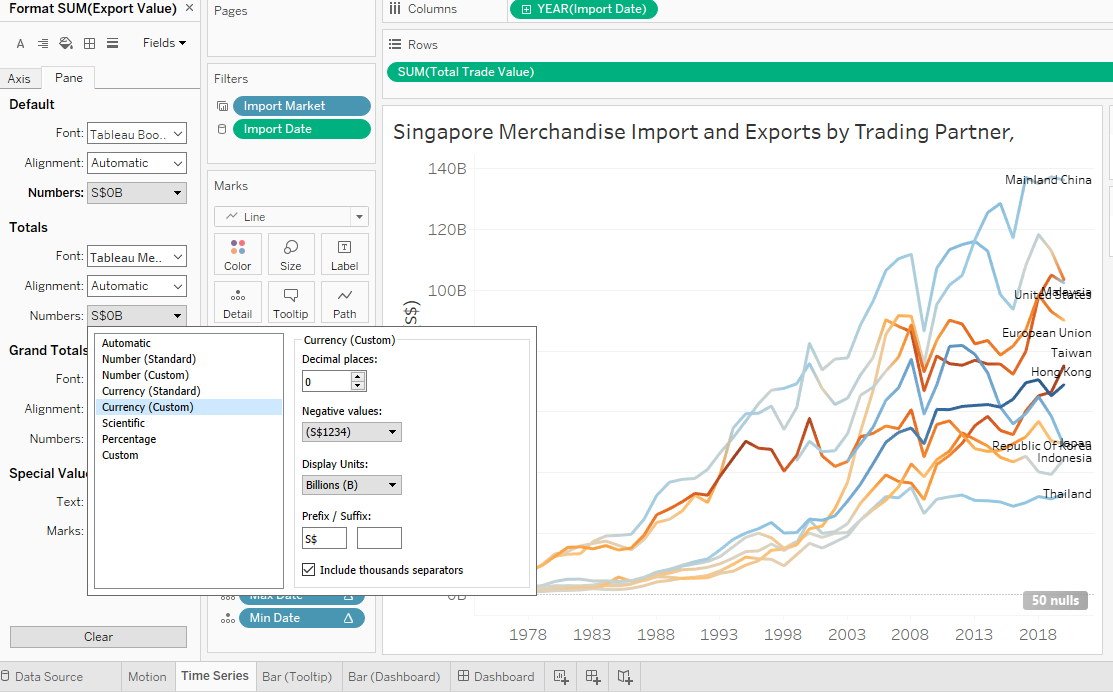 | S28 | Click on the black down arrow for “SUM(Import Value)” in the Tooltip shelf and click “Format”. Make sure you’re on the “Pane” tab. Change the Numbers setting to “Currency (Custom)”, 0 Decimal Places, “Billions (B)” Display Units, and S$ Prefix. Repeat this for Export Value, Total Trade Value, and Net Balance. |