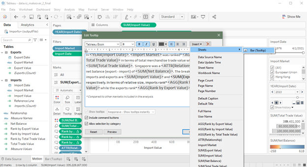 | S27 | Remember “Bar (Tooltip)”? Let’s insert that graph into the tooltip. Click on the “Insert” dropdown > “Sheets” > “Bar (Tooltip)”. Click “OK”. |