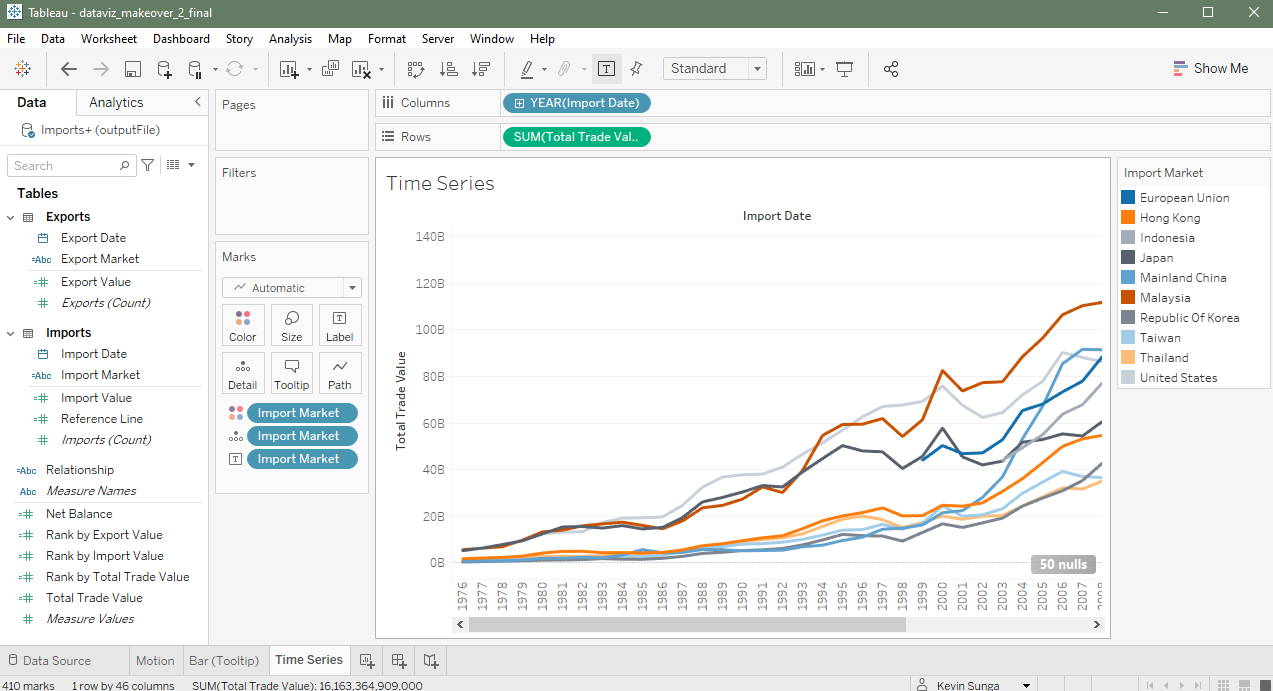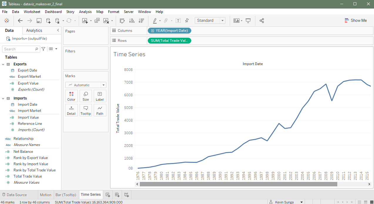 | S30 | We’re done with the “Motion” worksheet for now. Create a new worksheet and call it “Time Series”. Drag “Import Date” to Columns. Drag “Total Trade Value” to Rows. |
