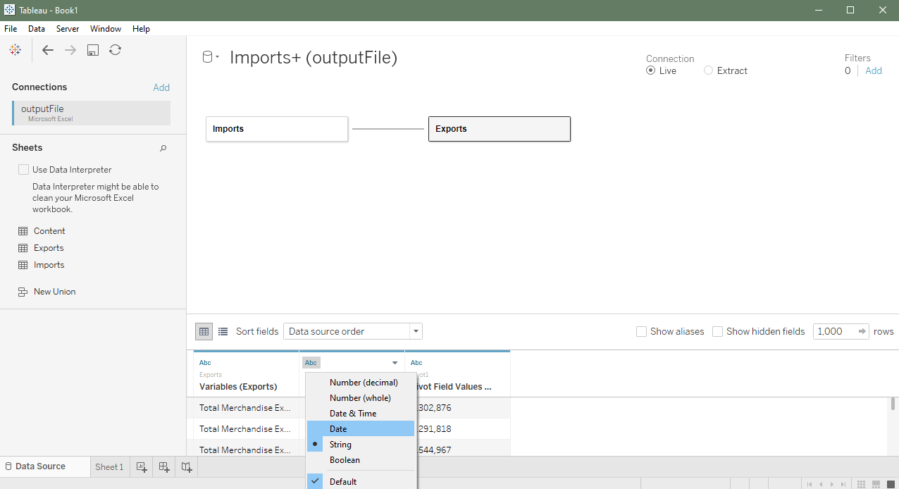 | S3 | After pivoting the import and export tables, we need to do some further data processing. Starting with the Pivot Field Names column in the import table, click on the “Abc” in the top left corner of the column and select “Date”. Rename the column to “Import Date”. Next, change the Pivot Field Values column to “Number (decimal)” and rename it “Import Value Raw”. Repeat for the export table. |