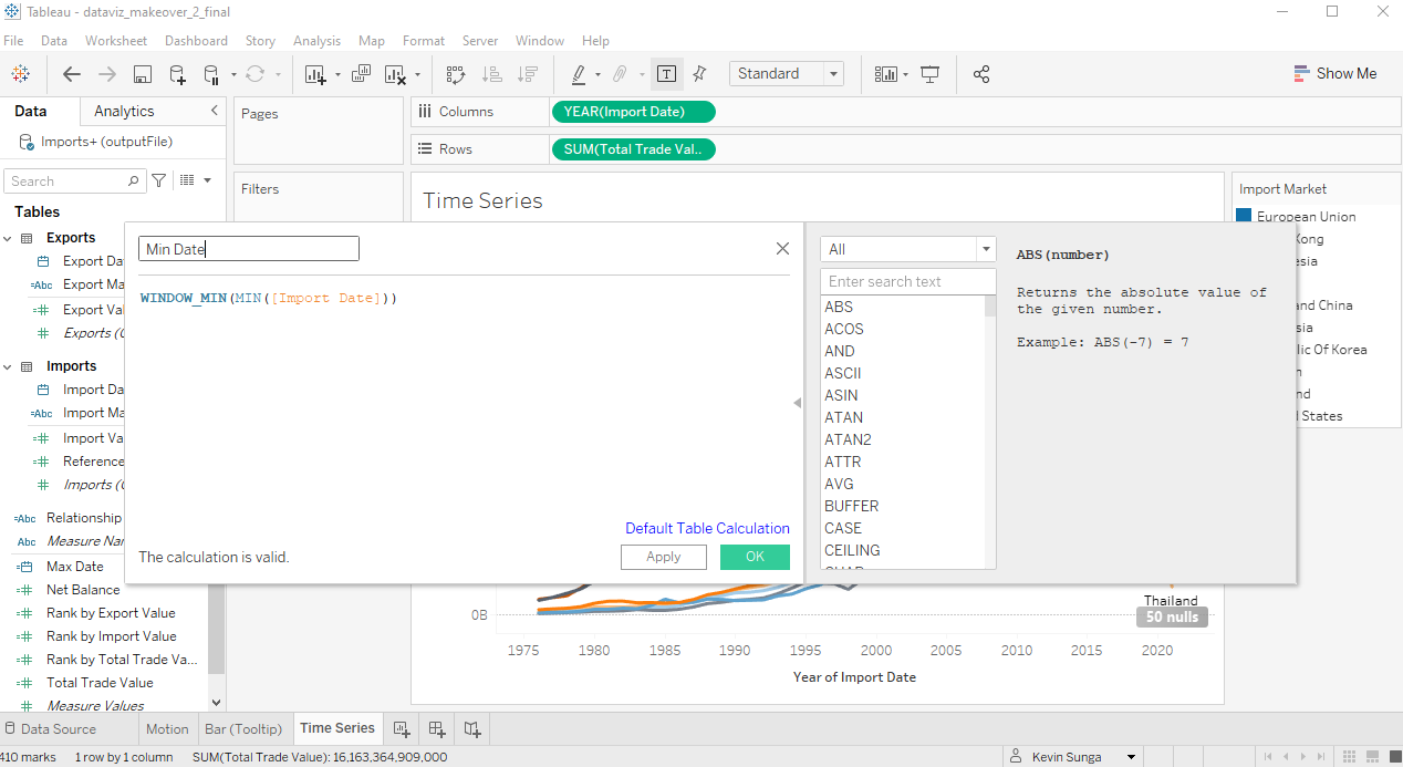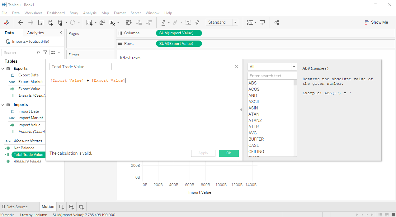| S9 | Next, we’re going to create some new fields to help us add more dimension to the graph. On the left pane, click on the black down arrow at the top right-hand corner and click “Create Calculated Field.” Name this field “Total Trade Value” and input the formula: Create another calculated field. Name it “Net Balance” and input the formula: |