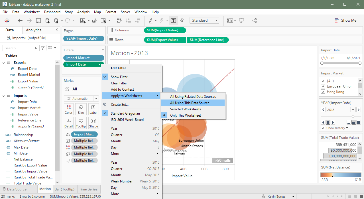 | S37 | Go back to the “Motion” worksheet. Right-click on the “Import Market” filter and click on “Apply to Worksheets” > “Selected Worksheets…”. Click on the checkboxes for “Time Series” and “Bar (Dashboard)”. | ![]() |