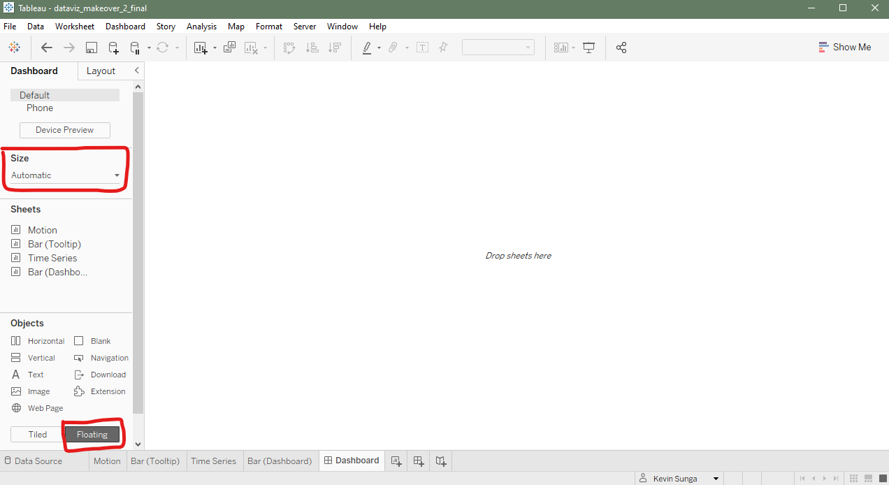 | S39 | We’ve created four graphs so far: a bubble chart, two bar charts, and a time series chart. Time to bring these components together into a dashboard view. Create a dashboard and name it “Dashboard”. Set up the dashboard view by changing the size to “Automatic” and change to “Floating”. |
