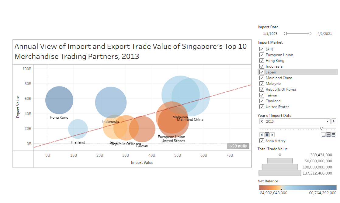 | C7 | It’s not possible to intuit from the graph whether Singapore as a country overall is a net importer or net exporter. | To be able to address this, a simple bar chart comparing imports and exports for Singapore inclusive of all the trading partners can be added to the dashboard view. This bar chart should be dynamic and change with the date and market filters on the dashboard. |