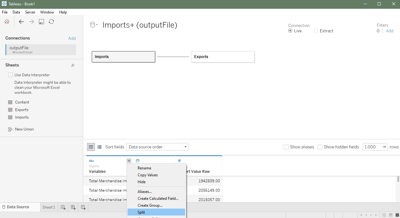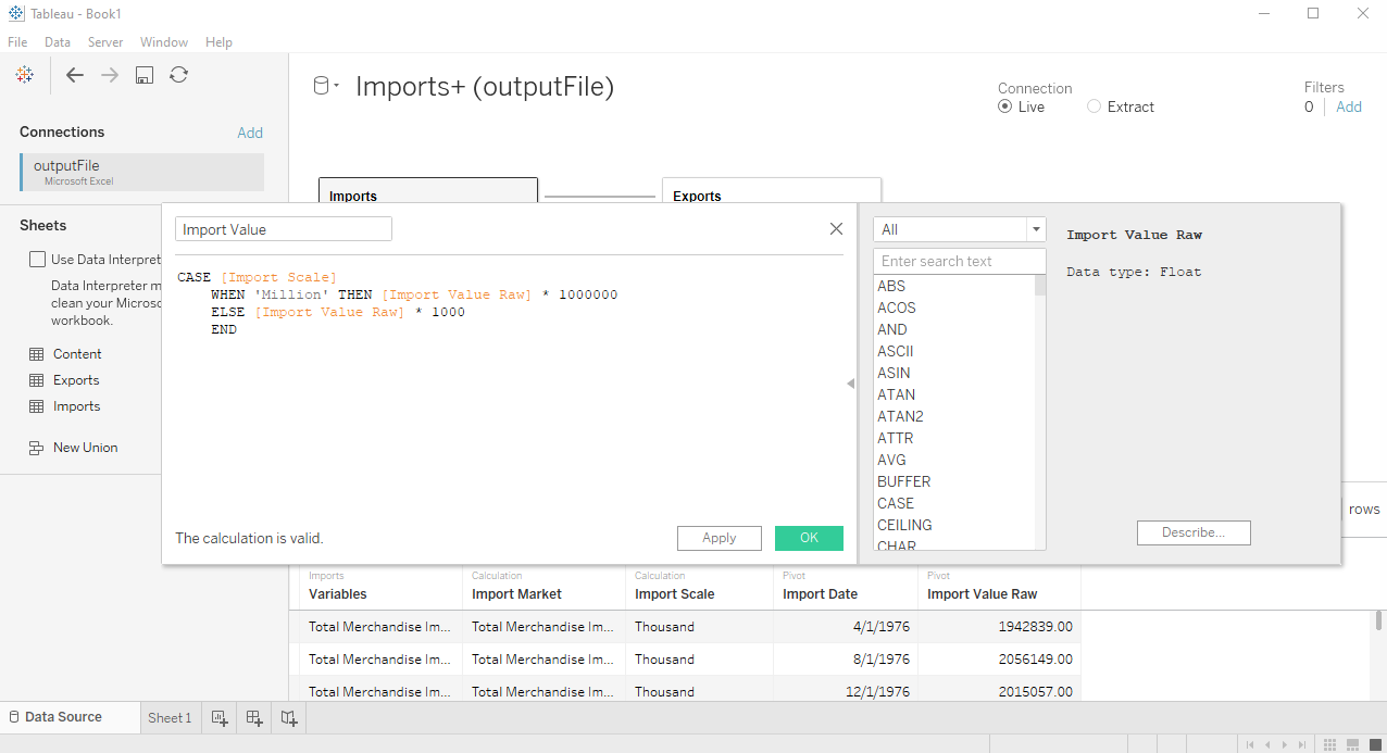 | S5 | Next, we want to create a new calculated field that normalizes the Value Raw columns. Click on the black down arrow in the Import Value Raw column and click “Create Calculated Field…”. Name this new field “Import Value” and input the following formula: WHEN ‘Million’ THEN [Import Value Raw] * 1000000 ELSE [Import Value Raw] * 1000 END Repeat for the export table. |
