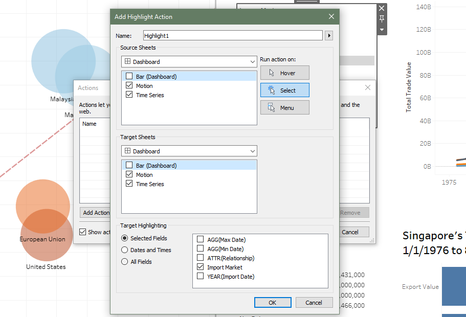 | S44 | To finish up the dashboard, let’s add an action. From the menu bar, go to “Dashboard” > “Actions…” > “Add Action” > “Highlight…”. For Source and Target Sheets, unselect the “Bar (Dashboard)”. For Target Highlighting, select “Selected Fields” and check the box for “Import Market.” |