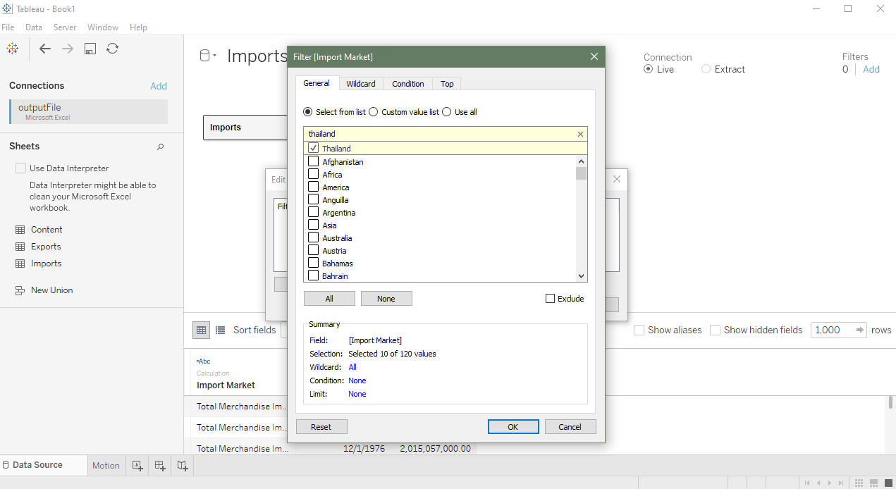| S7 | To finish the data prep phase, let’s add some filters to the Data Source. On the top right-hand corner, click “Add” > “Add…” > “Import Market”. Filter for Malaysia, United States, Mainland China, Japan, European Union, Hong Kong, Indonesia, Taiwan, Republic of Korea, and Thailand which are Singapore’s top 10 trading partners overall. | ![]() |